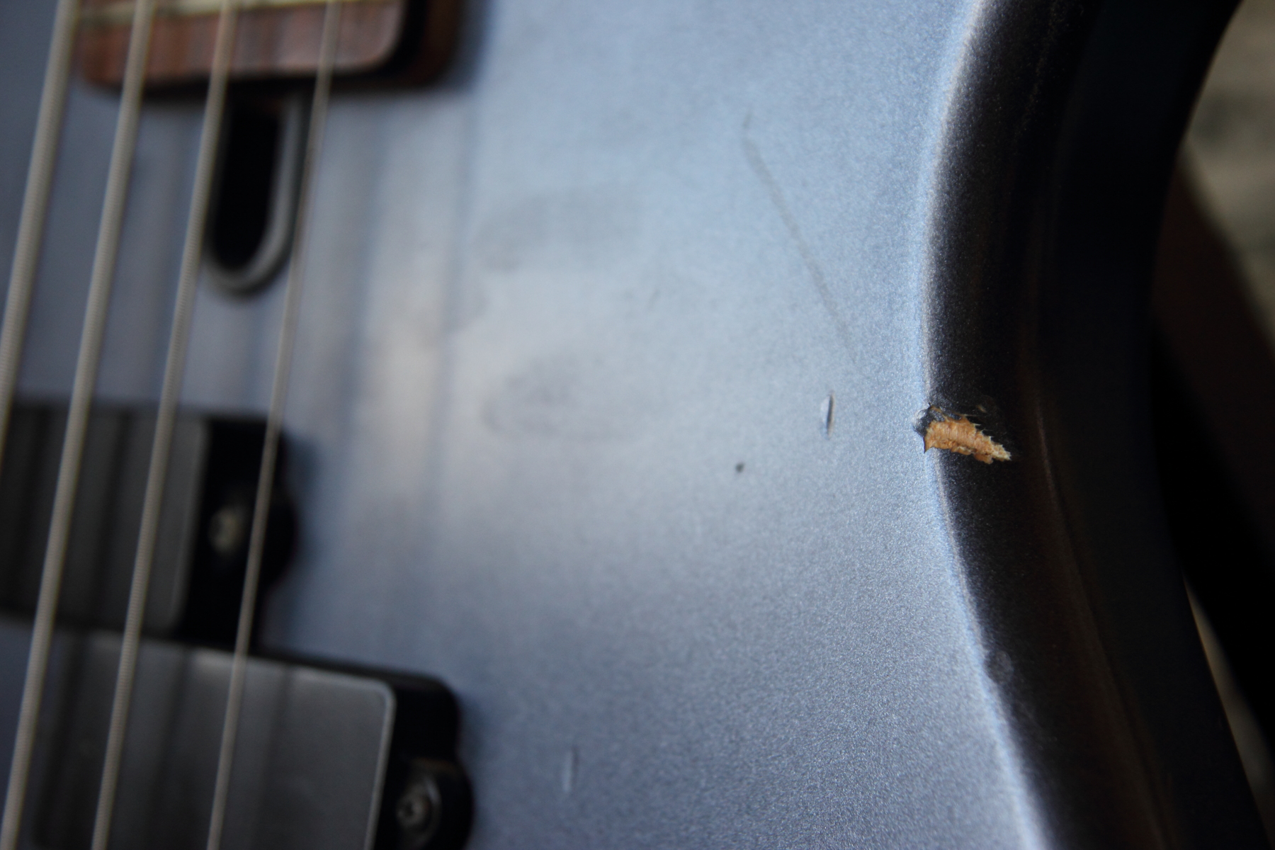 This bass wasn’t in a great condition when I first got it but I’d still give it about a 6 out of 10. Asides from a fairly bad bump on the front edge (below the pickups) there’s only really one other major thing to mention: I lost the back battery cover – it takes a 9V battery – and the back ‘electronics section’ cover. There’s also some scratching on the back.
