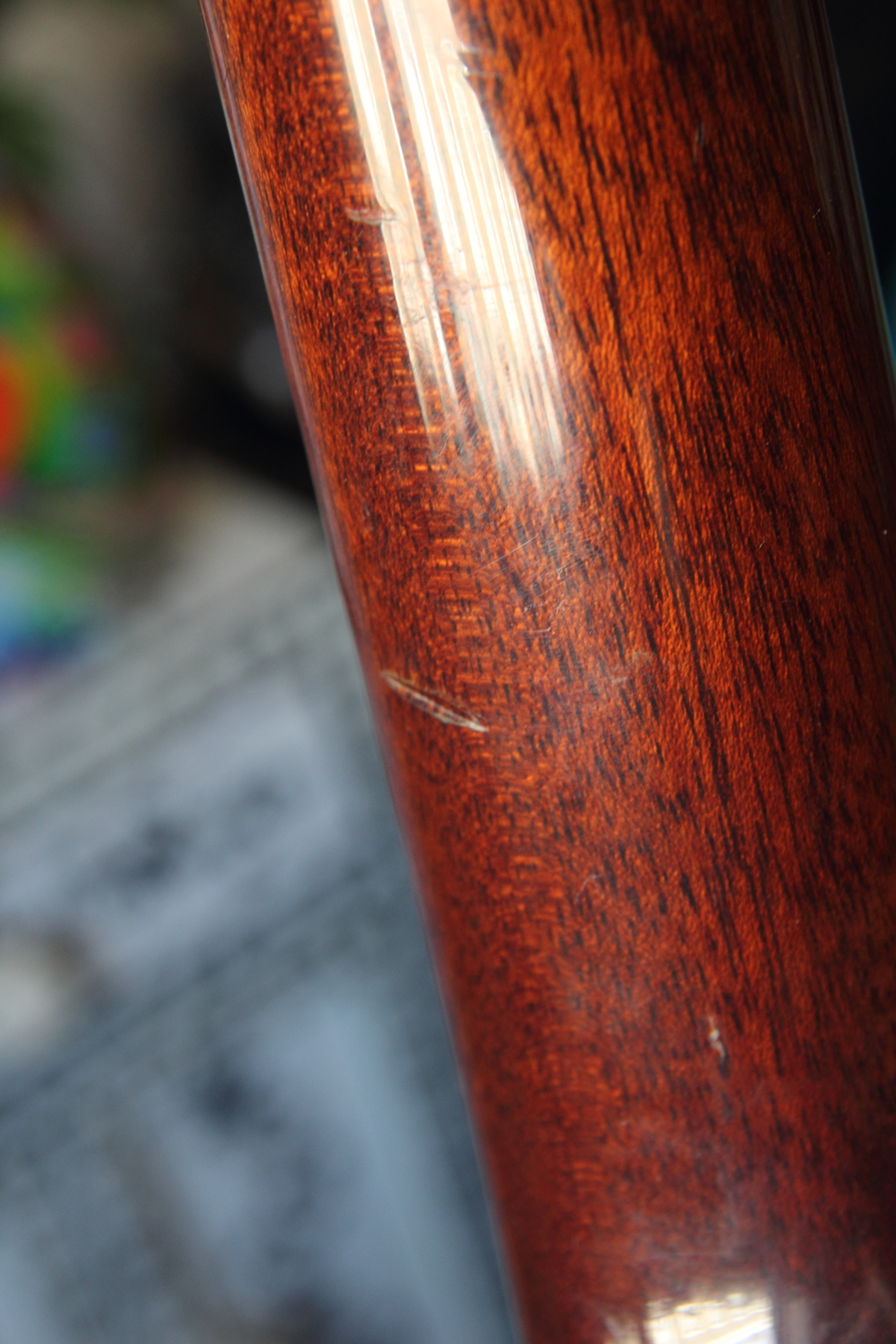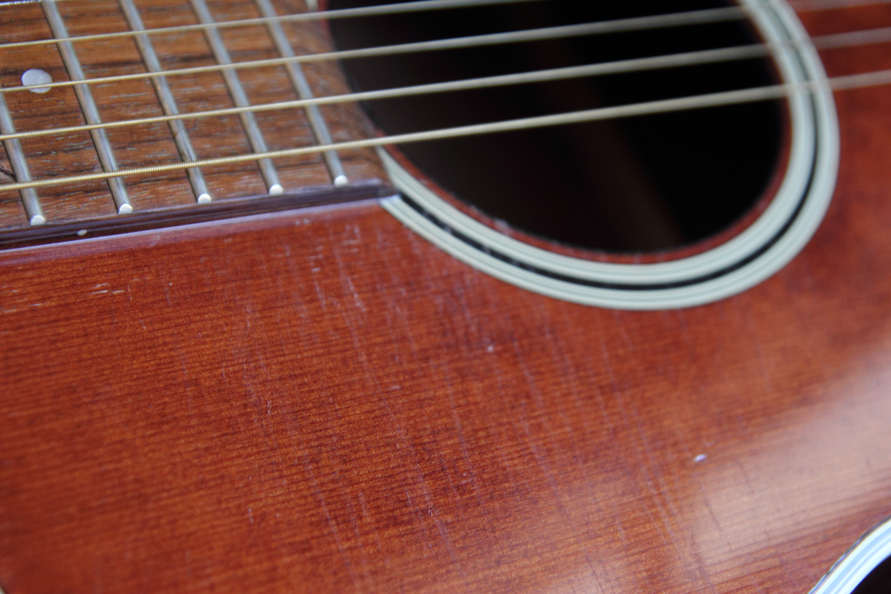 For this one I’ve tried to just take as many photos as I could. Hopefully they’ll give you a good idea of the damage. In short, there are 3-4 major knacks on the front, 1 on the fretboard, and one on the edge of the side and back. All around, there’s a variety of scratches and dents. Sorry but I really used to rock out quite hard on this guitar. Somehow in my old band we’d always come up with songs on the acoustic, jamming in the bedroom, but I’d then forget to ever switch to an electric. We ended up with quite a rocky sound but I’d still always play with this acoustic. In the end, it’d often get a bit of a beating on stage. Oh well…